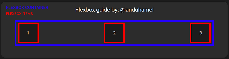 Flexbox is structured around two core components: the flex container and the flex items. In the following example the container is highlighted in color blue and the items in red: