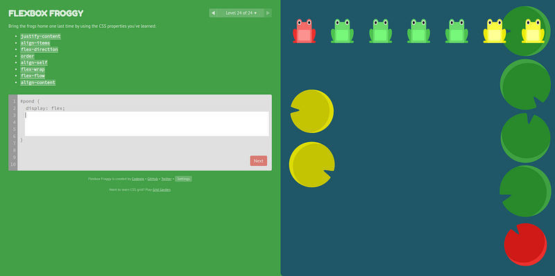 I encourage you to practice what you’ve learned here using the awesome game of Flexbox Froggy, which is a free educational game.